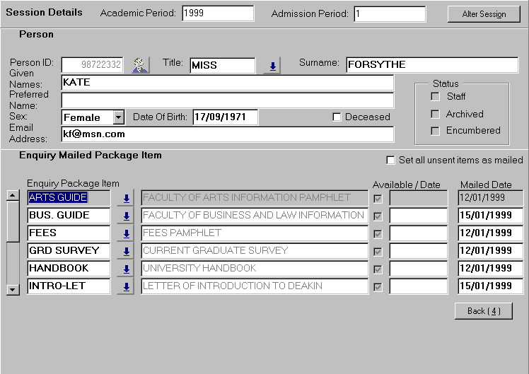 Display Mailed Package Items This overlay displays the enquiry package items to be mailed to the enquirer taking into account any course or information type details recorded. Items can be added to or deleted from the list as required to customise the package. Each item is listed as available for mailing, or a date indicating when the item is expected to become available, is displayed. This is dependent on the setup in the Maintain Enquiry Package Item form ( ADMF1150).When a package item is mailed to the enquirer, the date is inserted by ADMJ1320. Where all unsent items are mailed at the same time, the Set All Unsent Items As Mailed indicator can be selected. When the indicator is checked, the current date is inserted into Mailed Date for all unsent items. This is normally used when items are handed to a person at the institution. When this occurs, the status can be changed to COMPLETE to prevent processing in ADMJ1320. Select the Back button to return to the main record admission enquiry screen. |