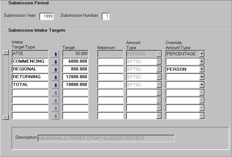 This form is used to record and maintain planning targets for the number of students enrolled at the census date for the institution. Each institution aims to enrol a number of students each year that meet defined characteristics. For example: hearing impaired, females in non-traditional courses, commencing or returning students. Submission student targets are recorded to establish the minimum requirements the institution aims to achieve. For further details on student intake targets refer to the Admissions for the Subsystem Specialist overview. |