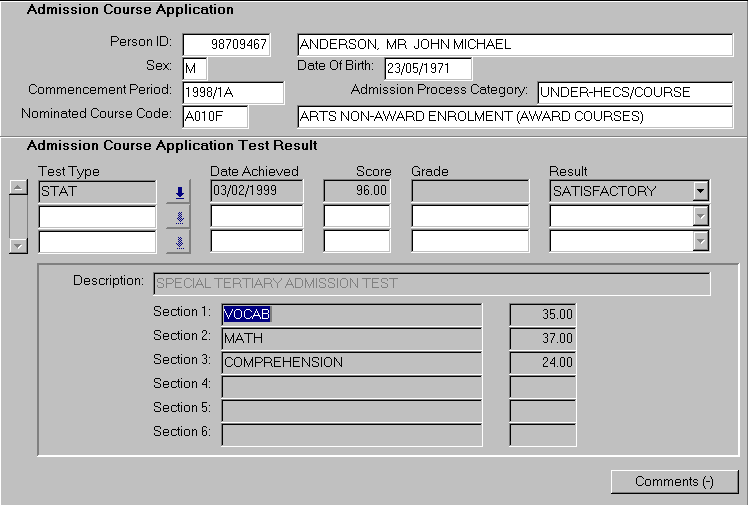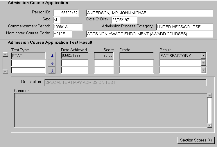 This form can be entered in context via the Admission Test navigation button in the Direct Admissions Course form (ADMF3240) or accessed directly through a menu allowing queries on the admission applicant details. To record test details:
