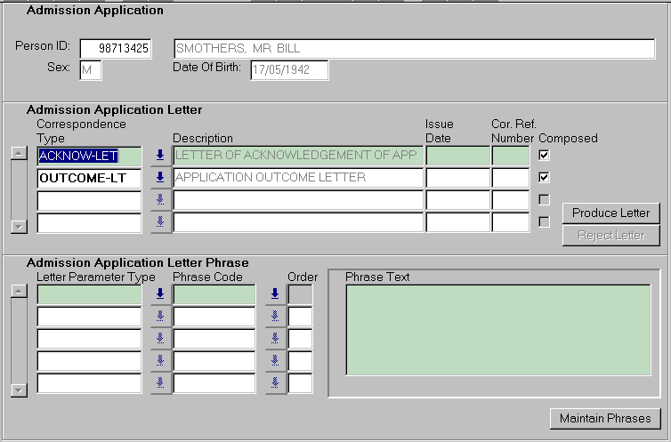 This form is accessed by selecting the Letter navigation button in ADMF3240. Admission letters include acknowledgment and outcome letters, functionality provided by the acknowledgement letter button |
