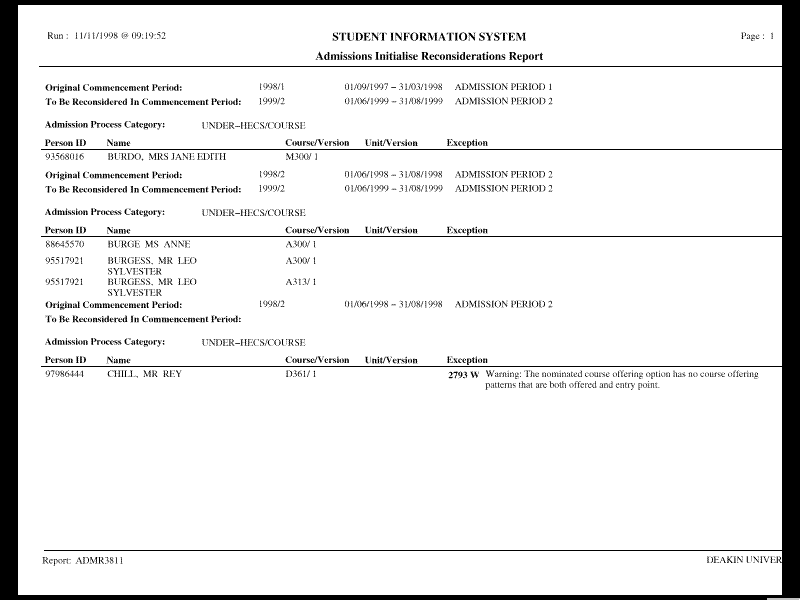 This process updates the outcome status of unsuccessful admission applications that have requested reconsideration in the next available admission period so that they may be considered again for selection in the new admission period. The process looks for admission applications that have an outcome status of NO-QUOTA or REJECTED and also have the Request for Reconsideration checkbox selected in Direct Admissions - Course ( ADMF3240).Applications that meet the criteria are then checked to see if their course offering option is available in the next admission period. If these conditions are met, the application outcome status is reset to PENDING and the Request for Reconsideration checkbox is deselected (this can be reset manually as required). |