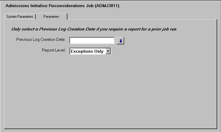 The job is typically scheduled to run as a standing request nightly in the Job Scheduler. Each night this job runs, it checks to see if the value of the Initialise Admission Period date alias matches the current date. If the dates mismatch, the job cancels. If the dates match, the update process is performed. The Initialise Admission Period date alias instance value would normally be near the beginning of the admission period. For details on setting up the Initialise Admission Period date alias, refer to Configuring Admission Calendars in the subsystem specialist overview or the Maintain Admission Calendar Configurations form ( ADMF02R0).Refer to the Job Control and Scheduling subsystem for details on scheduling and running standing requests. |