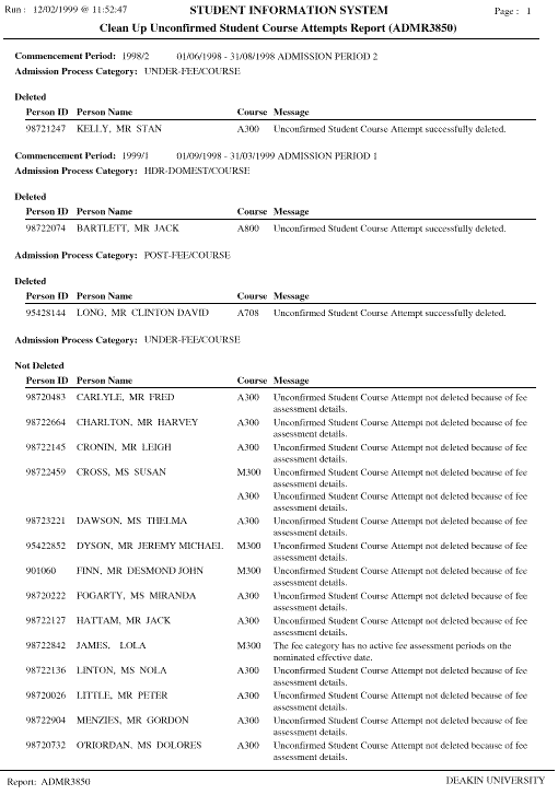 When deleting unconfirmed student course attempts, any fee assessments are reversed provided the effective date of the fee assessment was set to a date that is later than the course commencement date. Otherwise ADMJ3850 does not reverse the fee assessment because it uses the course commencement date as the effective date for reversing fee assessments. If contract and sponsorship details have been established in the Establish Fee Contracts form ( ADMF3660) and a predictive fee assessment has been run, the process will: