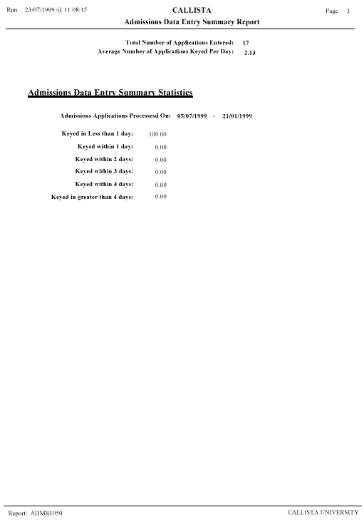 This report provides statistics on an institution's abilities to process applications within a time frame. The report details the number of applications for admission keyed on a particular date against the range of dates recorded for receipt of the applications. |