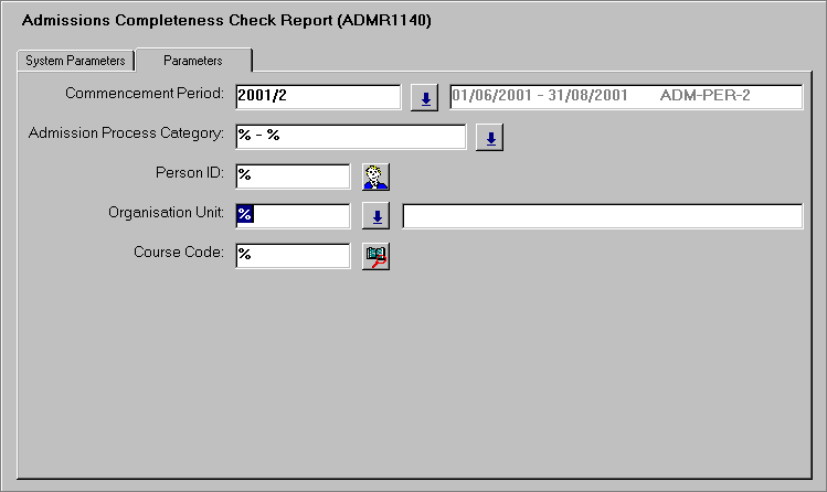 This report displays information on the completeness of person and admission application records for the selected parameters. This enables the user to detect and correct missing data that would prevent an offer being made to the applicant. Items that have been designated as mandatory in ADMF2M30 are checked. |