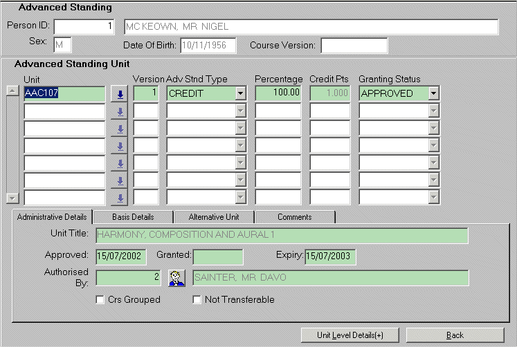 This is the context block and displays details of the student and course version to which advanced standing unit details displayed in the block below apply. This screen is invoked via the navigation button in either the Student Advanced Standing screen or the Advanced Standing Unit Level Details screen. The information displayed here is for the same student and course version as selected in that screen. No queries can be performed in this block. |