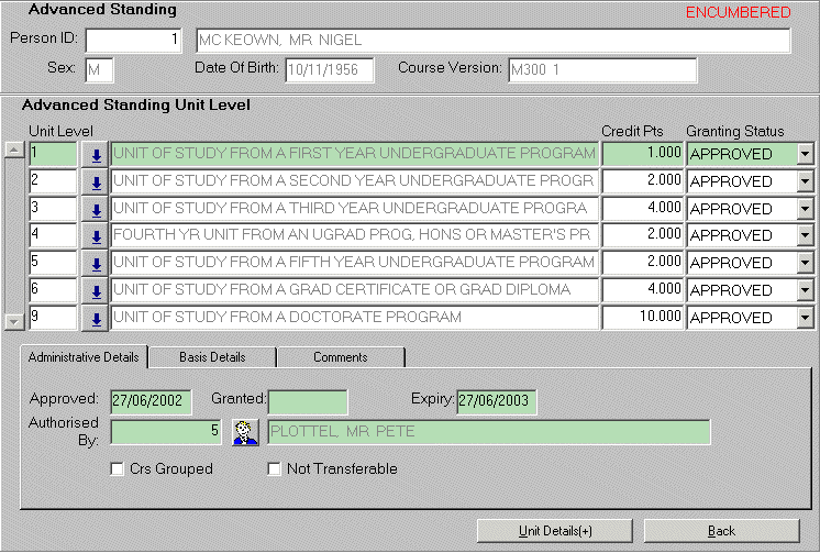 This is the context block and displays details of the student and course version to which advanced standing unit level details displayed in the block below apply. This screen is invoked via the navigation button in either the Student Advanced Standing screen or the Advanced Standing Unit Details screen. The information displayed here is for the same student and course version as displayed in those screens. No queries can be performed in this block. |