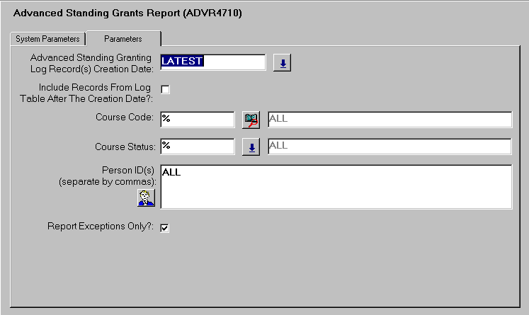 Most parameters for this job are used to refine the data set produced in the report. The Advanced Standing Granting Log Record(s) Creation Date allows the user to select a log created on a specified date. The log contains the details of the advanced standing applications recorded on the specified date. The Include Records from Log table After the Creation Date parameter, when set to 'Y', allows the report to retrieve all advanced standing records from the creation date selected in the previous parameter to the current date. When set to 'N', the report displays applications recorded o the creation date selected. The Person ID(s) parameter allows the user to run the report for a specific person or person's. Where several person ID's are to be listed, separate the ID's with commas. This report can be run for all advanced standing applications recorded on the creation date or can list exceptions only. Exceptions are those advanced standing applications that have not been granted. |