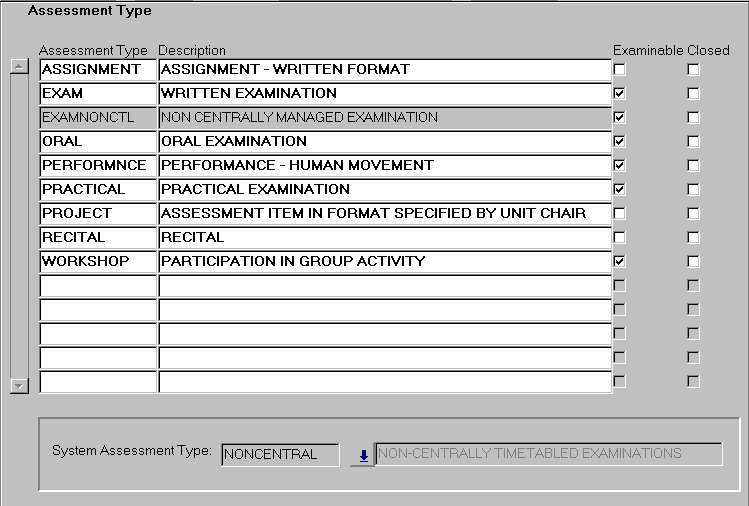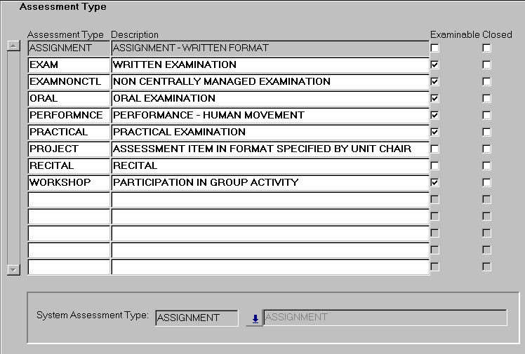 Use this form to record institution defined assessment types. Assessment types are used in the definition of an assessment item in Maintain Assessment Items (ASSF2100). Assessment types might include ASSIGNMENT - assignment, EXAMCTL - centrally managed examination, ORALFACLTY - non centrally managed oral examination. Indicate whether the assessment type is examinable or not. Different sets of data are collected for examinable and non-examinable types and different processes are applied to them. (e.g. Examinable items can be passed to the examination timetabling process.) Optionally assign a system assessment type to the assessment type. This is required in some cases to enable System functionality to apply. (e.g. Assessment items are recognised for assignment tracking purposes only where they are of an assessment type mapped to the system assessment type ASSIGNMENT.)Refer to All About Assessment Items in Understanding Assessments. |