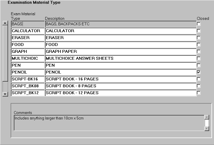 Use this form to record institution defined exam material types. Exam material types are items that may be supplied to students sitting examinations, or which they may be allowed or not allowed to take into examinations. Supplied, allowed and not allowed material types for each examination are recorded in the Maintain Assessment Item Exam Materials form (ASSF2123). Examples of exam material types are calculator, notes, dictionary, text book and script books. |