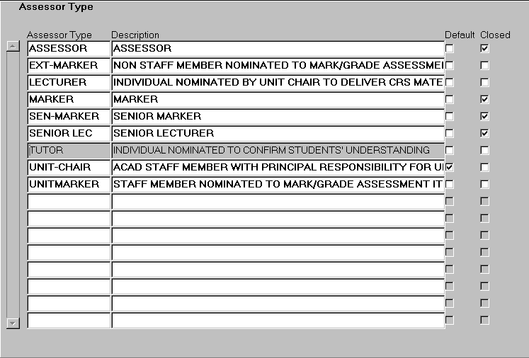Use this form to record institution defined assessor types. Assessor types might include MARKER and UNIT CHAIR Assessor types are used to classify assessors in Maintain Assessment Items (ASSF2100). Indicate whether the assessor type is the default or not. When a new unit assessment item is created, the System also automatically creates an assessor. The assessor type it assigns to the assessor is the default type. However, this can be altered. |