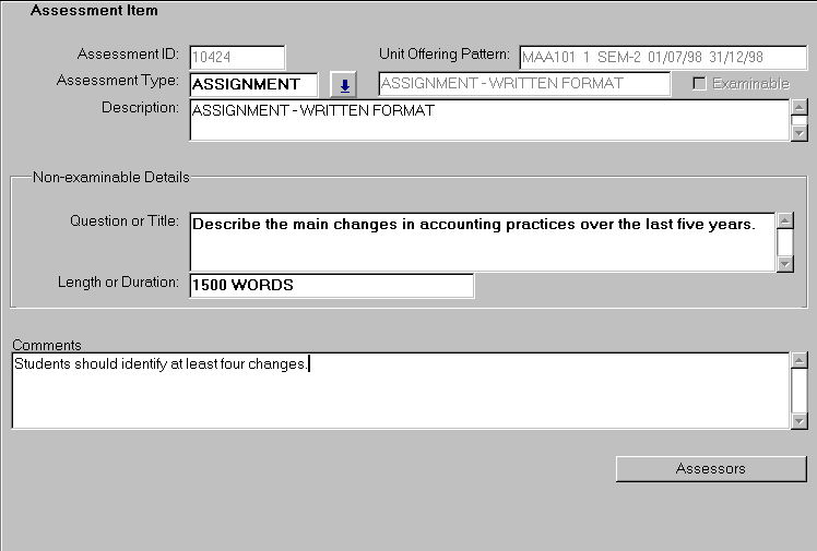 Non-Examinable Assessment ItemsWhere the assessment type is a non-examinable item such as ASSIGNMENT, the Non-Examinable Details block is displayed. Record details of the non-examinable assessment item. Mandatory details are assessment type and description. The assessment ID is inserted upon saving the record. When creating a non-examinable assessment item via the Maintain Unit Assessment Items form ( ASSF2310), the description is defaulted from the assessment type description.Use the Assessors button to invoke the screen in which assessors can be assigned. |