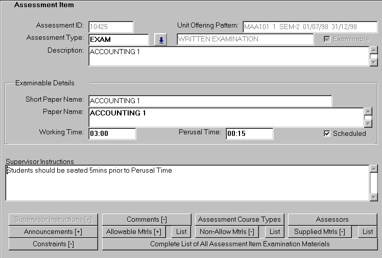 The three List navigation buttons and the Complete List of All Assessment Item Examination Materials navigation button all access Maintain Assessment Item Exam Materials ( ASSF2123). Use ASSF2123 to create and maintain details of allowed, not allowed and supplied examination materials.