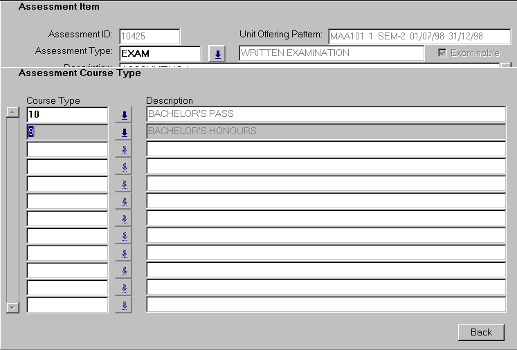 The Assessment Course Types button invokes a block in which course types are associated with the selected assessment item. Associating a course type restricts the application of the assessment item to student unit attempts within that course type/s only. Adding or deleting a course type here, causes the action date (viewed in ASSF2310) for any unit assessment items based on this assessment item to be changed to the current date. Callista uses the action date to determine if there are any changes to a unit assessment item that need to be applied to students enrolled in the unit, via the process Apply Unit Assessment Item Modifications to Student Units (ASSJ3213). |