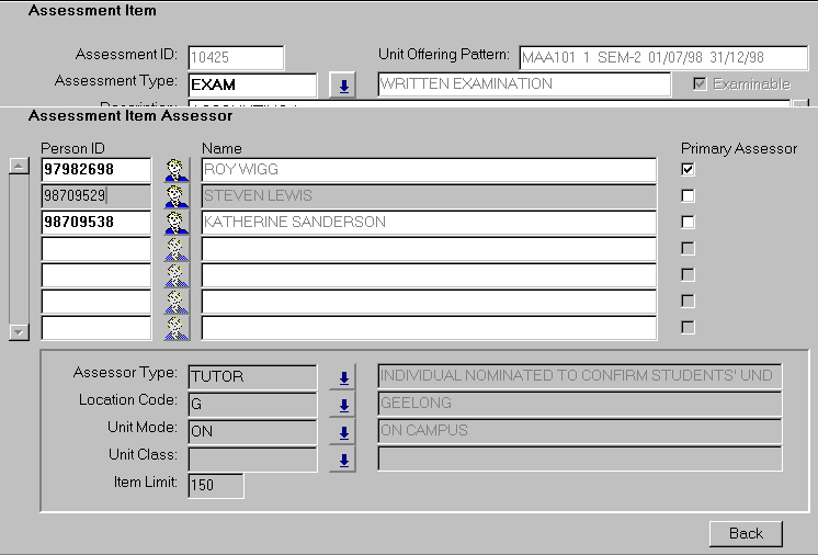 The Assessors button invokes a block in which assessors are associated with the selected assessment item. Assessors are designated an assessor type.The same assessor may be associated with an assessment item more than once. For example, an assessor may exist as a marker for an assessment item at Location X and also as a marker at Location Y, but not Location Z. Assessors are assigned a location code and unit details, though these are not compulsory. Each assessor may also be set an item limit indicating the maximum number of assessment items they may mark. The Primary Assessor is allocated as the responsible senior assessor for the assessment item. For example, the unit moderator or chief assessor. It is not mandatory, but recommended that a primary assessor be assigned to each assessment item. There is currently no specific functionality that uses this indicator. |