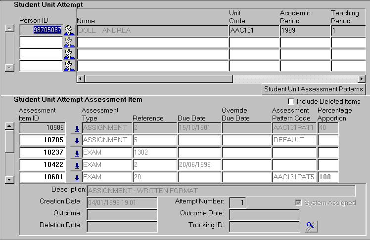 - The deletion date is entered by the System when the assessment item is deleted from the student unit attempt and assessment item queries can be displayed with or without logically deleted items via the Include Deleted Items checkbox.
