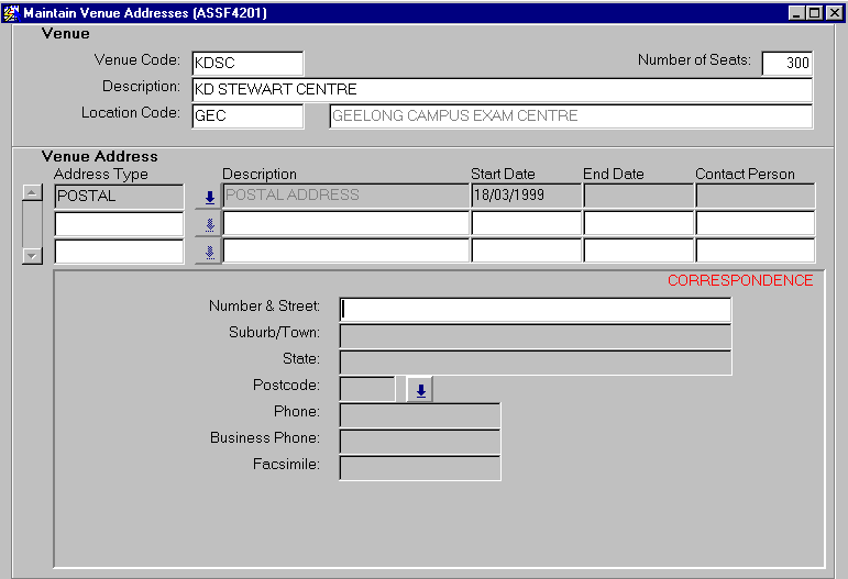 This form is used to record addresses for a venue. Venue addresses are used in reports such as the Exam Venue Allocation report (ASSR0680 under development) and the Exam Supervisor Labels report (ASSR1060). Multiple addresses may be recorded, one of which may be a correspondence address. The form is entered in context via the Venue Addresses navigation button in Maintain Venues (ASSF4200). For further information on examination locations and venues, refer to Managing Examination Details in Assessments for the Subsystem Specialist. For further information on graduation locations and venues, refer to Specialist Functions documentation. |