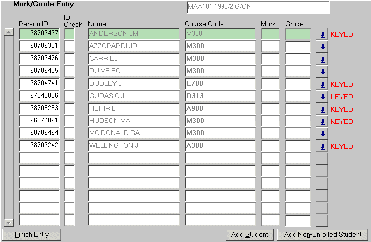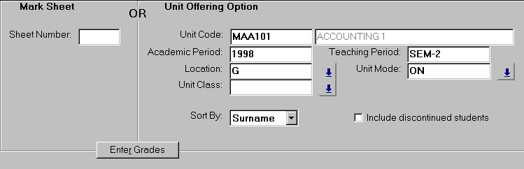 | 4 | Click on the Enter Grades button to display the Mark/Grade Entry screen. The screen displays all students enrolled in the unit before or after the mark sheet was produced. (The Add Student button is disabled). | |