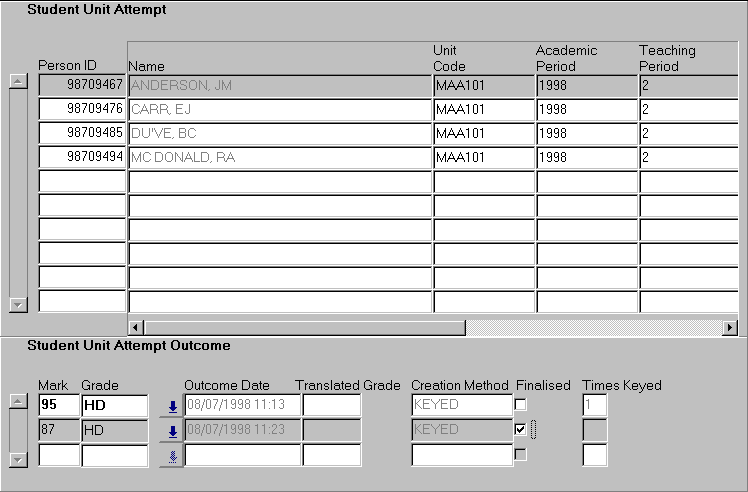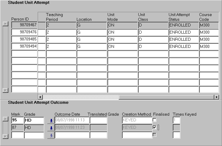 Use this form to amend the marks or grades recorded for a student's unit attempt. It is typically used to amend results after bulk keying of outcomes in the Mark/Grade Entry form (ASSF5330). These changes can occur before or after results are finalised and published. Finalised Outcomes Finalised outcomes cannot be overridden unless the finalised indicator is changed first (this is not recommended). The normal practice is to create a new outcome record to replace a finalised grade. Recommended Outcomes Recommended outcomes can be amended either by overwriting the existing grade/mark (not recommended) or creating a new outcome record to replace the existing grade/mark. If large numbers of amendments to recommended outcomes are required, for eample: following Boards of Examiners (or equivalent authorities) meetings, ASSF5330 can be used to overwrite outcomes. However, this will only be possible if the form has been configured to allow overwriting of grades in the Maintain Results Entry Configuration form (ASSF01K0). Whilst details of overwritten grades are not displayed in ASSF5330 or in this form, a history record is created which can be viewed in a history form or via the Audit facility. Outcome records are displayed in date order, forming a history of outcome changes. The result recording process is fully explained in Assessments for the Subsystem Specialist. |