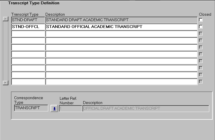 Use this form to record institution defined transcript types. This form is used to create the available set of transcript types used when producing transcripts on-line for individuals or in batch mode for multiple persons. Each transcript type is mapped to a system letter definition, identified by a correspondence type and letter reference number. System letter definitions are maintained in the Maintain System Letter form (CORF2520), where each is mapped to a template file. |
