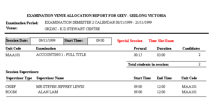 This report details the date, time, papers, number of students and supervisors for each examination venue. |