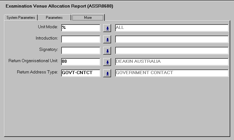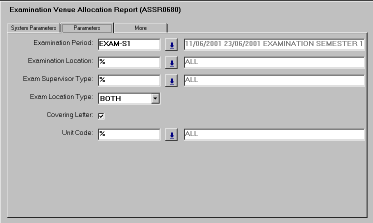 Most parameters for this job are used to refine the data set produced in the report. The Examination Location parameter contains examination locations that have venues that have availabilities. The parameter is an unrestricted LOV. The Covering Letter parameter allows cover letters to be included. It is likely that cover letters would not be printed for internal (CAMPUS) exam locations. There are two text parameters that allow the user to enter data. They are: