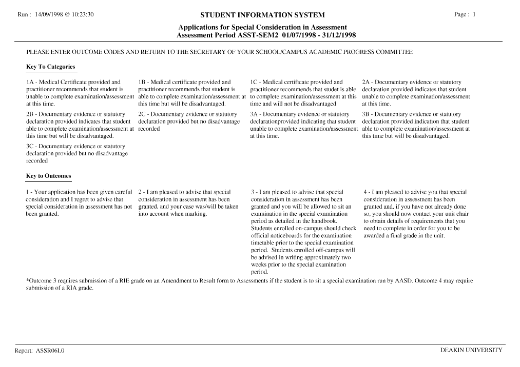 This report is presented in landscape mode. The first page of the report displays information on the keys to special consideration categories and outcomes. This page appears prior to each unit offering option so that each contact/coordinator receives a copy. |