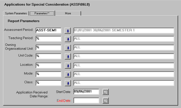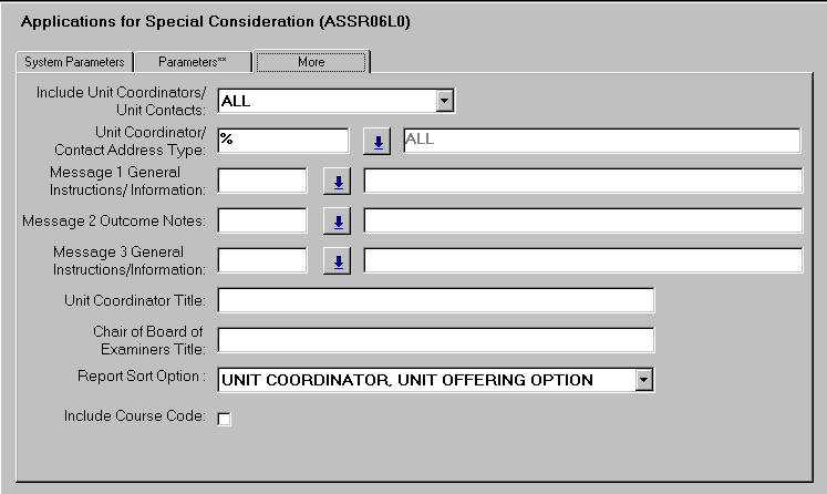 This job is run during assessment periods to advise unit coordinators and/or unit contacts of students with unresolved special consideration applications. It is recommended that this job be run in batch mode. However, it can be run online, particularly where the report is run with parameters specifying a small data set, such as a specific unit code. Refer to the Job Control and Scheduling subsystem for details of scheduling and running batch jobs. |