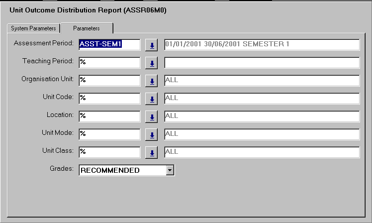Most parameters for this job are used to refine the data set produced in the report. For example: the report may be run for every unit offering within an assessment period or for a specific unit offering option. The report is set to produce either recommended or finalised grades. It cannot run both in the same report. |