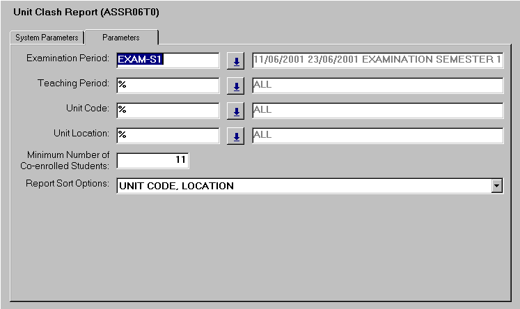 All parameters are used to limit the set of data reported. The Minimum Number of Co-enrolled Students parameter allows the report to be produced for only those clashes where a critical number of co-enrolled students is involved. |