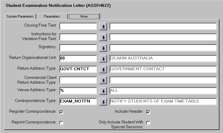 By default, the text fields will insert the most recently used text. Text messages can recorded in the Maintain Job Text form ( JBSF4170).The Return Organisational Unit and Return Address Type parameters insert address information for where students may inquire about any problems with the timetable. These two fields are mandatory. Note: a valid return address type must be listed for the organisational unit. For commercial exams, optionally record a commercial client return address type. Note: a valid commercial client return address type must be listed for the Commercial Course Owning Organisational Unit parameter selected on the first page of the parameter form. When selected, the Venue Address Type parameter displays details of the venue address where the exam is being held. If the parameter is not selected, no address details are displayed. Select the correspondence type.