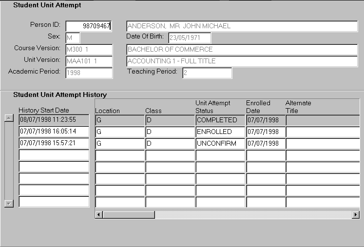 This form is used to display the history of changes to a student's unit attempt record. The data displayed in this form is maintained in the Record Enrolments - Unit form (ENRF3000). |