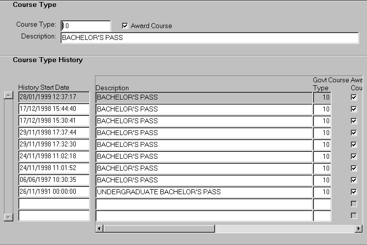 This form is used to display the history of changes applied to a course type. The data displayed in this form is maintained in the Maintain Course Types form (CRSF1110). |