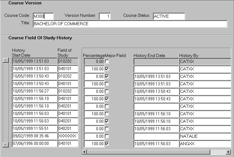 This form is used to display the history of changes to the field of study applied to a particular course version. The data displayed in this form is maintained in the Maintain Course Field of Study form (CRSF1260). |