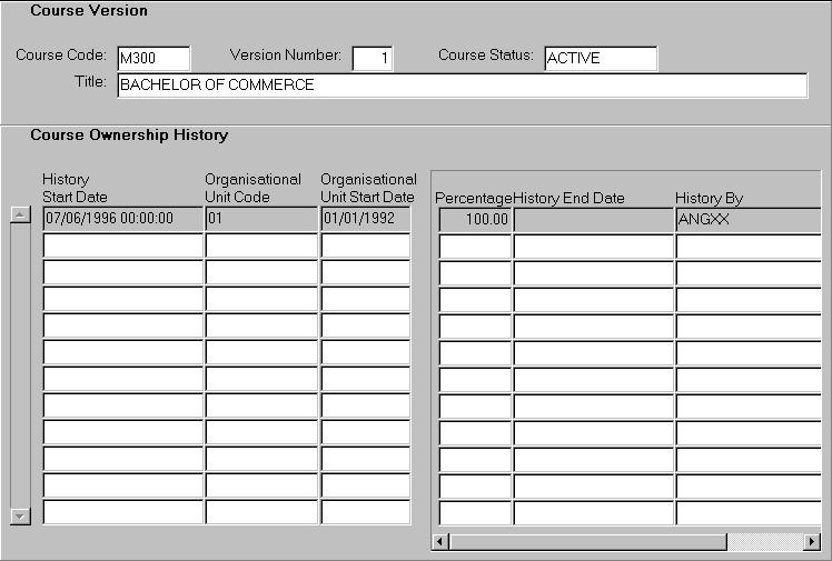 This form is used to display the history of changes to the ownership applied to a particular course version. The data displayed in this form is maintained in the Maintain Course Ownership form (CRSF1220). |