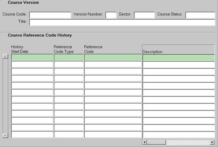 Use this form to display the history of changes to the reference codes applied to a particular course version. The data displayed in this form is maintained in the Maintain Course Reference Codes form (CRSF1290). |