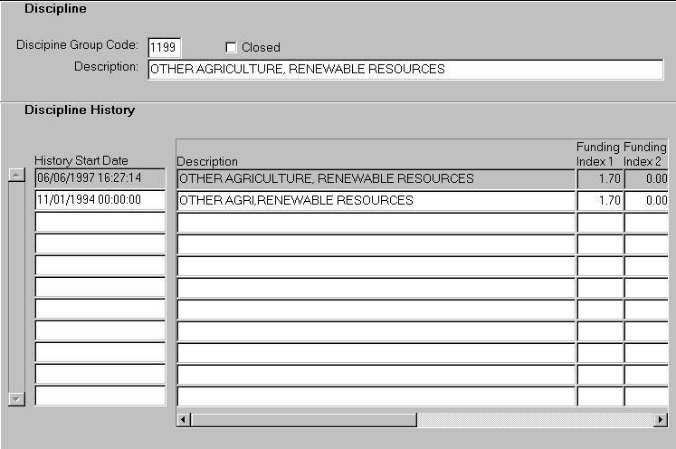 This form is used to display the history of changes applied to a discipline group code. The data displayed in this form is maintained in the Maintain Disciplines form (CRSF2110). |