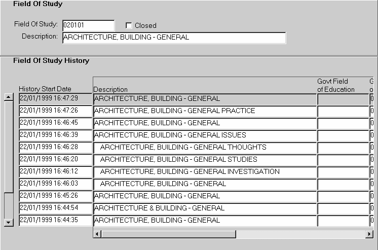 changes applied to a field of study. The data displayed in this form is maintained in the Maintain Fields of Study form (CRSF1140). |