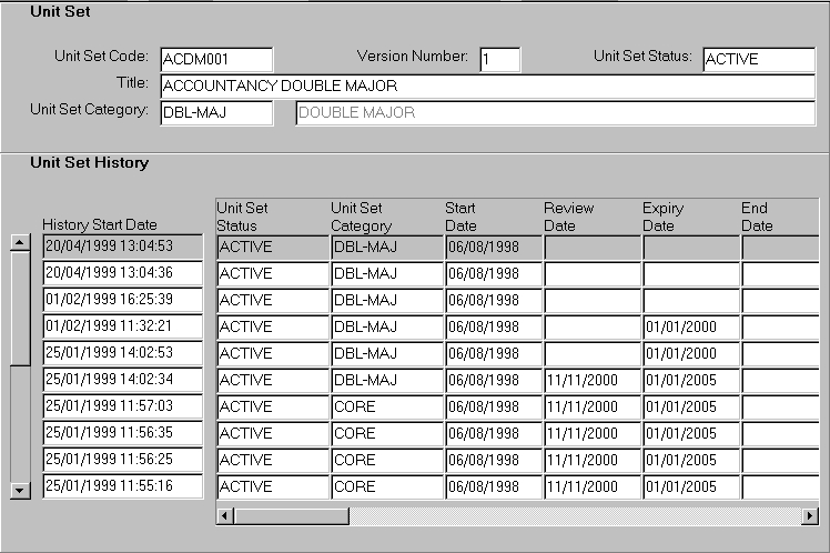 This form is used to display the history of changes applied to a unit set. The data displayed in this form is maintained in the Maintain Unit Sets form (CRSF4200). |