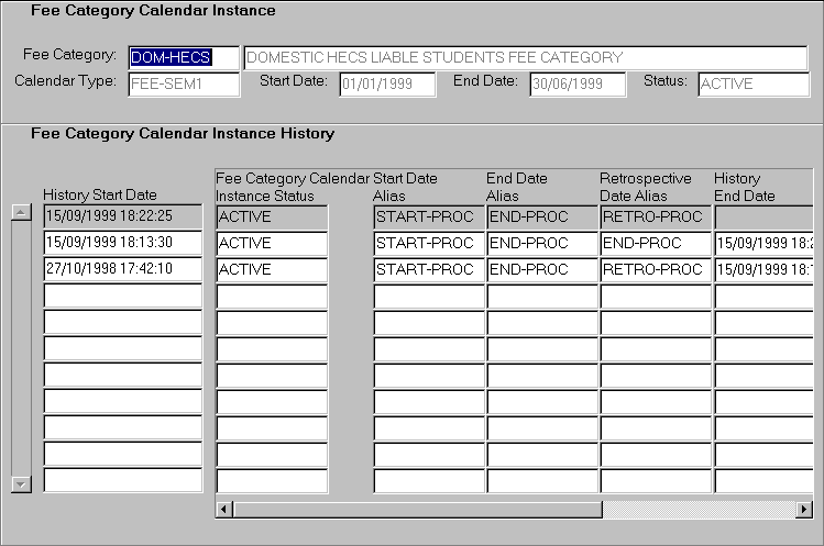 This form is used to display the history of changes to a fee category calendar instance. The data displayed in this form is maintained in the Maintain Fee Categories form (FINF2800). |