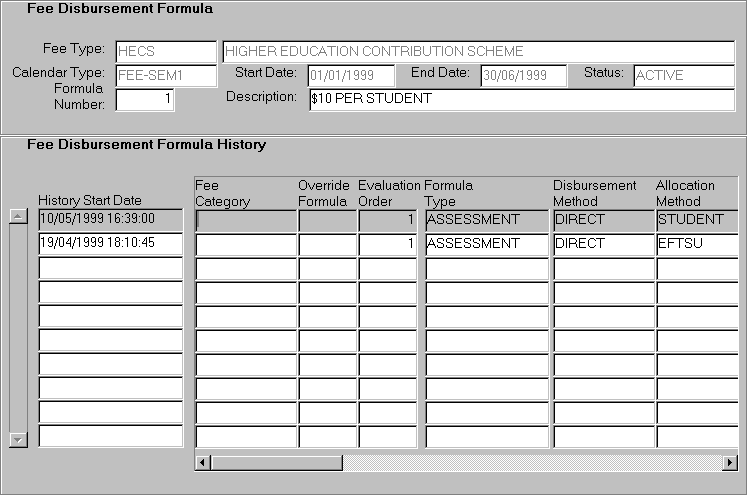 This form is used to display the history of changes to a fee disbursement formula for a fee type and fee period. The data displayed in this form is maintained in the Maintain Fee Disbursement Formula form (FINF7210). |