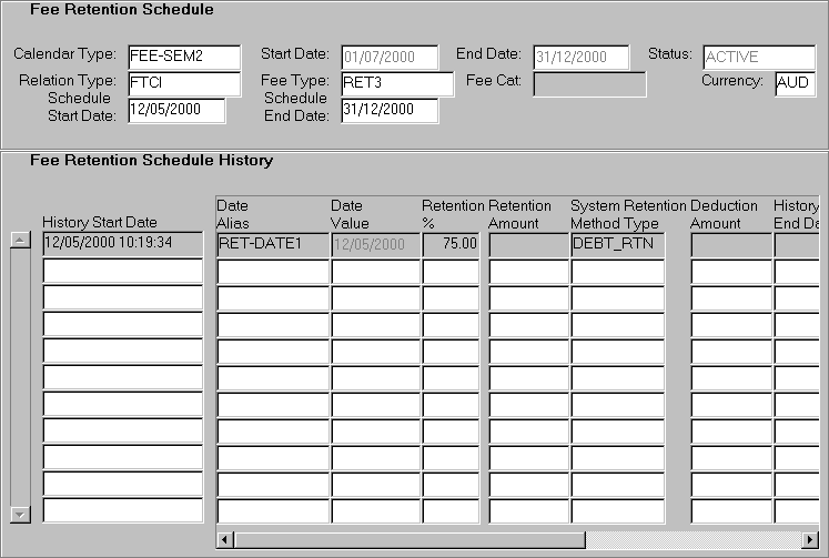 This form is used to display the history of changes to a fee retention schedule. The data displayed in this form is maintained in the Define Retention Schedule form (FINF28A0). FINF28A0 is accessed via: |