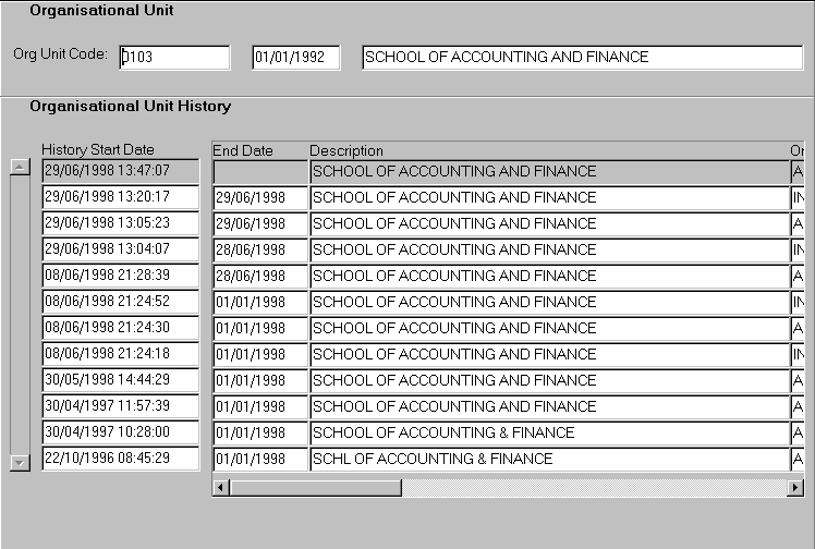 This form is used to display the history of changes applied to an organisational unit code. The data displayed in this form is maintained in the Maintain Organisational Units form (ORGF0141). This form replaces the Organisational Units History form (ORGF0320). It can be accessed in context via the Org Unit History navigation button in ORGF0141. |