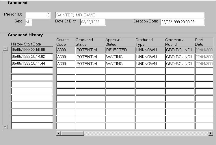 This form is used to display the history of changes applied to a graduand's record. The data displayed in this form is maintained in the Maintain Graduand Details form (GRDF4200). |