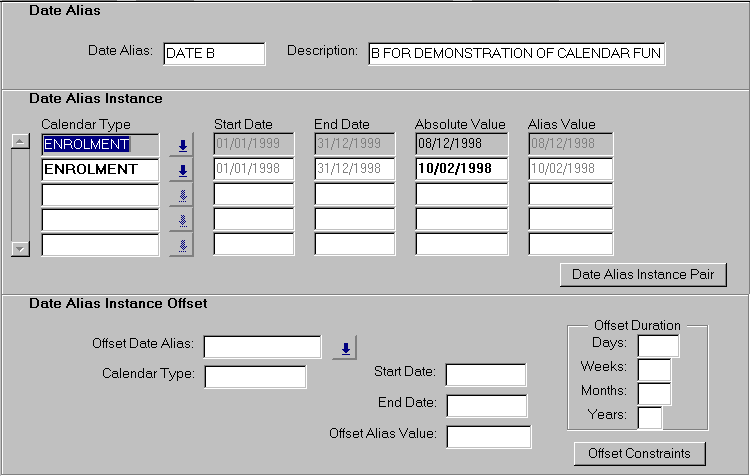 Date alias instances are the specific occurrences of a date alias, generally defined by having a date and being attached to a calendar instance.This context block displays the date alias for which existing date alias instances can be displayed, modified or deleted or new ones created in the block below. Only one date alias is displayed and this is brought forward from the Maintain Date Aliases form. To display another date alias it is necessary to return to the Maintain Date Aliases form and query the new date alias. Data in this block is protected and cannot be updated. |