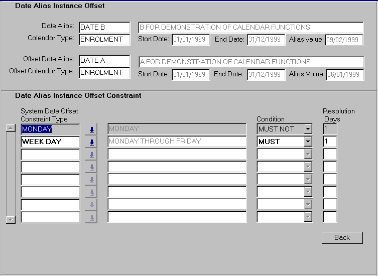 This form is accessed via navigation buttons in the Maintain Date Alias Instances forms (CALF0511 and CALF0512). In those forms, a date alias instance is able to be defined in terms of an offset from another date alias instance. The date of the second instance is calculated as the first date plus or minus the offset. This form is used (optionally) to ensure that the calculation of the second date results in that date falling on 'acceptable' days. For example, the second date can be constrained to fall outside Institution holidays or only on a weekday or only on a Wednesday (or any valid combination of any of the constraints). This feature is particularly valuable when calendars are 'rolled over'. Date alias instances determined by offsets in the 'new' calendars will have their dates set according to the constraints rolled with them. With constraints defined, when an instance of the first date alias is created, the date of the second is calculated as the first date plus the offset. If this falls either on a day specified by a constraint as unacceptable or doesn't fall on a day specified as the required day, the date is moved forward or backward until the constraint is satisfied. For example, if the calculated date of the second date alias instance falls on a Saturday, and the constraint WEEKDAY,MUST (i.e. date alias instance must fall between Monday and Friday inclusive) has been specified for the date alias instance, the instance is moved forward to Monday (resolution days set to +1 or +2) in order to satisfy the constraint. Monday's date forms the date alias instance. In each case a number of resolution days must be specified. If the calculated date falls on a day which conflicts with the recorded constraints, the System moves the calculated date forward or backward that number of days. For example, if resolution days is set to 2, and the constraint MONDAY, MUST NOT is set, and the date calculated from the offset falls on a Monday, the date is moved forward two days to Wednesday. If the resolution days was set to minus (-)2, the date is moved back to Saturday. |