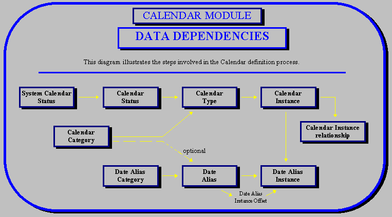 is institution defined data. It permits the definition of specific occurrences of a calendar type. A calendar instance is created by assigning a start and end date and a calendar status to a calendar type. For example, a calendar instance representing the first semester of 1999 can be created by assigning a start and end date (say, 01/01/99 and 30/06/99) and a 'future' status to the calendar type SEM-1. |