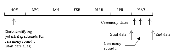 For example, in the Graduation subsystem it is recommended that a calendar instance be set up to indicate the period during which graduation ceremonies are actually held (ceremony round 1 in this case). The start and end dates of this period have no specific functionality associated with them, and serve only to define the particular instance of ceremony round 1. Specific date alias instances are attached to this calendar to provide functionality, such as the date on which identification of potential graduands for the ceremony period can start (start date alias instance) or the three dates on which ceremonies will be held.