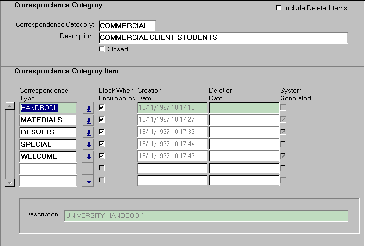 Use this form to record correspondence categories determined by your institution. Correspondence categories cannot be deleted if they have any other data associated with them. Close them, preventing further use, instead. Associate with the selected correspondence category the correspondence types which students in that category are eligible to receive. Selecting the Block When Encumbered checkbox stops the issuing of items of that correspondence type to students with an encumbrance which has an effect such as S_COR_BLK - System generated correspondence blocked or SUS_SRVC - All services withdrawn. The automatically entered creation date is the date on which this relationship record was created. Correspondence category items are logically deleted. To view all deleted items for the correspondence category, select the Include Deleted Items checkbox and re-query the bottom block. The System Generated checkbox is an indicator in this form and is set in CORF2110.Recording a New Correspondence Category and Associating Correspondence Types with Correspondence Categories provide further information. |