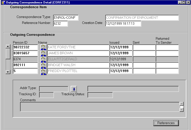 This block displays a list of students who have been sent the correspondence item shown in the block above and is used to record students receiving manually issued correspondence items. Data is automatically recorded for System generated correspondence. Use the References button to navigate to CORF2321 to view reference details for any student and correspondence item.Correspondence returned to the institution because the student no longer resides at the address to which the item was sent is recorded by entering a date in the Returned To Sender field. Address type details are automatically recorded for System generated correspondence, and entered here for manually issued correspondence. This enables the address to which a student's correspondence item was sent to be identified and, where the item was returned, the end dating of that address (making it obsolete) using the Maintain Person Address Details form ( ENRF3030).Some System jobs automatically create a tracking item record for the correspondence item. Details of such tracking jobs are displayed here. |